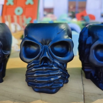 Caveira com as mãos a tapar a boca, no topo tem uma cavidade que dá para colocar uma pequena planta ou mesmo uma vela do tipo tealight.