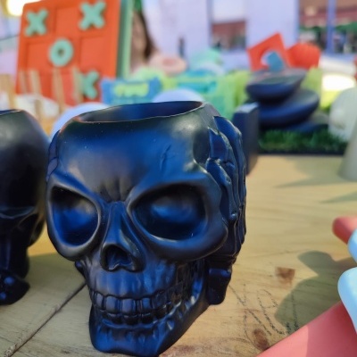 Caveira com as mãos a tapar os ouvidos, no topo tem uma cavidade que dá para colocar uma pequena planta ou mesmo uma vela do tipo tealight.
